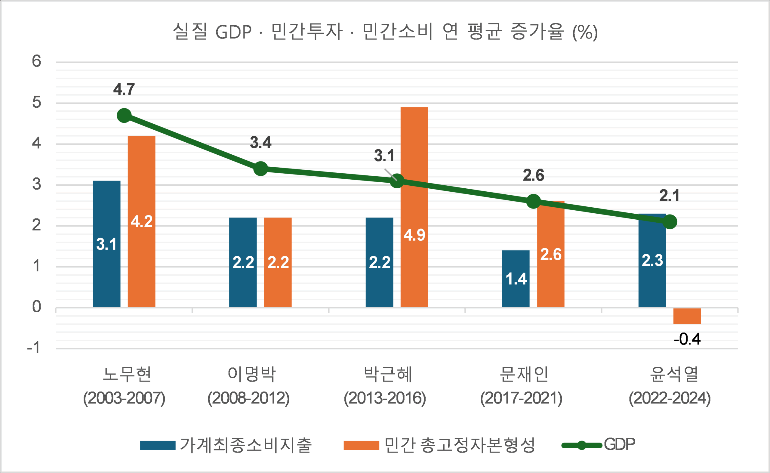 문재인 정부는 집권하자마자 최저임금을 큰 폭으로 올리고, 장기연체자 채무를 탕감했으며, 코로나 팬데믹으로 침체한 경기를 살리기 위해 소비 지원금과 지역화폐를 엄청난 규모로 뿌렸지만, 민간 소비와 투자는 악화 일로를 걸었습니다. 실물경기가 주저앉는 와중에도 코스피 지수는 3300까지 천정부지로 올랐고, 집값은 폭등하여 자산시장은 역대급 호황을 누렸습니다. 그 대가는 5년 만의 정권교체였습니다. 임기 5년을 다 채우지 못하고 파면당한 박근혜 대통령과 윤석열 대통령의 집권기간 각각 4년과 3년, 나머지 세 대통령은 5년 집권기간 동안의 연평균 실질 GDP 성장률, 민간부문의 고정자본투자와 소비지출 증가율입니다. 지난 20여년간 민간소비 증가율은 경제성장률을 크게 밑돌았습니다. 윤석열 정부 시기 코로나 팬데믹으로 억눌렸던 민간 소비가 되살아나면서 처음으로 민간소비 증가율이 경제성장률을 약간 앞 섰지만, 초유의 민간 투자 마이너스 충격 탓에 성장률은 역대 최저치인 2.1%로 주저앉았습니다.